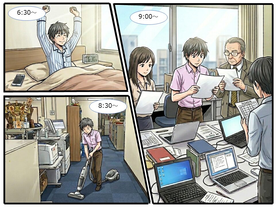 | 8:30~ | 出勤 今週は掃除当番でした! 分担して会社をきれいに。その後メールチェックも済ませます。 |