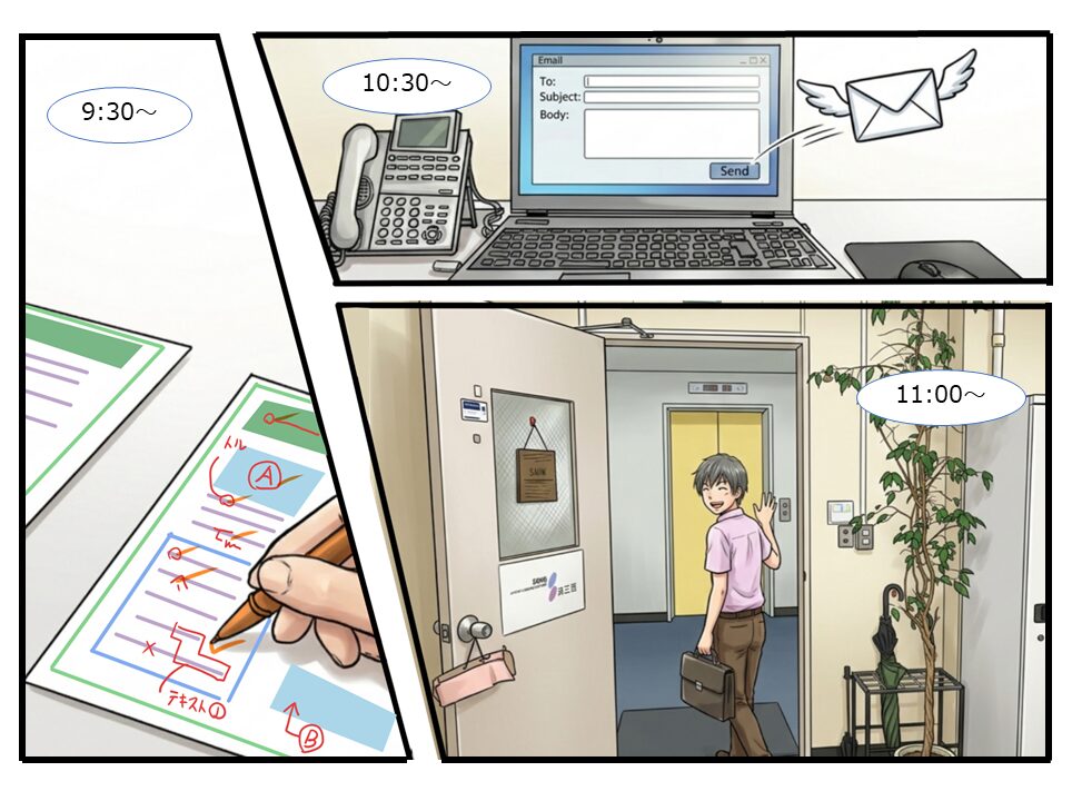 | 10:30~ | 校正出し 内校して、きちんと修正がされていることを確認したらメールでお客様に校正を送付します。 |