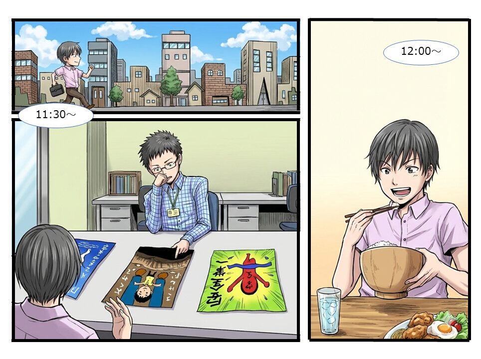| 11:30~ | お客様訪問(ラフ出し) 近所にあるお客様なら徒歩で営業に向かいます。 今回は、安全啓発のポスターを作成したいと依頼があったお客様にラフをお渡しします。ラフは、お客様から伺った作成理由(コンセプト)やデザインイメージを元に3パターン作成しました。 |