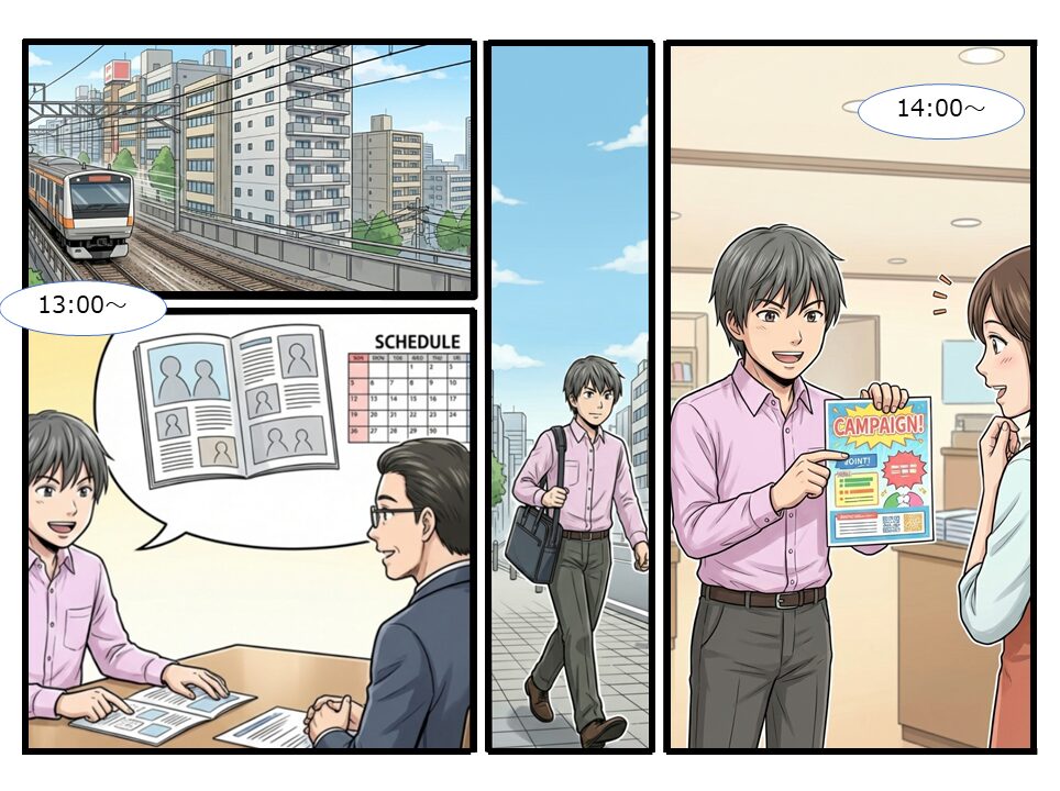| 14:00~ | お客様訪問(訪問) 3件目のお客様を訪問。休暇取得キャンペーンの特集がしたいとお話いただいたので企画を考えることに。企画の提案は1週間後。 また他の担当者の方から「ちょうどよかった」と声を掛けられました。組合員説明会のための映像を作りたいとのことで、内容やスケジュール、ご予算などの希望を伺い、資料を準備することに。次回打ち合わせのアポイントを取りました。 |