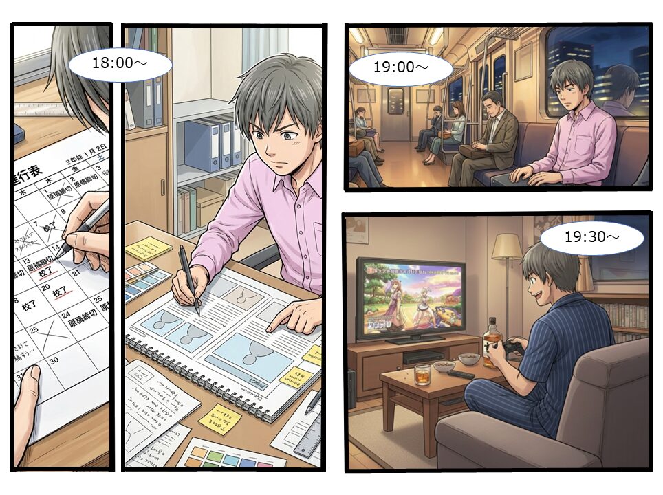 | 17:30~ | 校正戻り お客様にお戻しいただいた赤字を整理し制作にお渡し。お客様から聞いた修正意図や赤字内容を説明し修正作業に入ってもらいます。 |